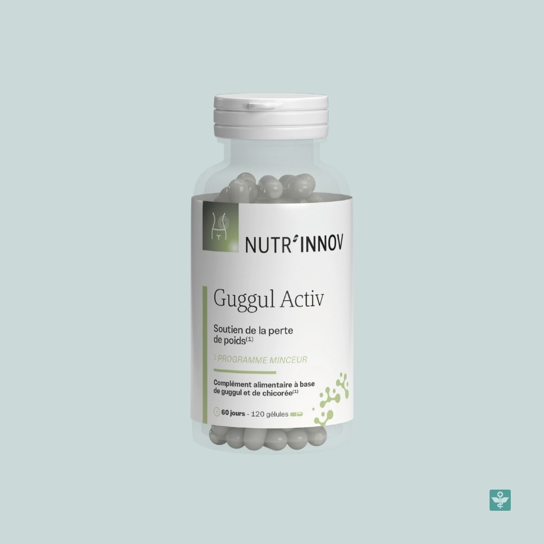 Guggul Activ est un complément alimentaire Nutr’Innov sous forme de gélules qui associe la résine de gomme de guggul et la racine de chicorée sauvage. Il est destiné à accompagner un programme de gestion du poids. L’utilisation recommandée est de 2 gélules le matin au petit-déjeuner avec un grand verre d’eau. Déconseillé aux femmes enceintes ou allaitantes, ainsi qu’aux personnes allergiques aux plantes de la famille des Astéracées.