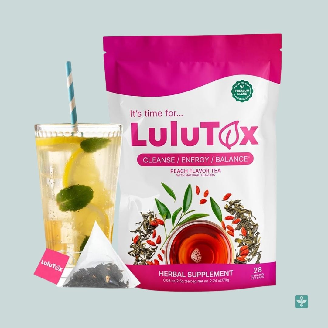 Le thé détox Lulutox est un mélange de tisanes aromatisé à la pêche en sachets, composé d’un assortiment de thés et de plantes tels que le thé vert matcha, le maté, le thé oolong, le thé vert sencha, la feuille de pissenlit, le ginseng, le chardon-Marie, la feuille d’ortie, la citronnelle et les baies de goji. Il est présenté comme favorisant le bien-être quotidien et le confort digestif.
