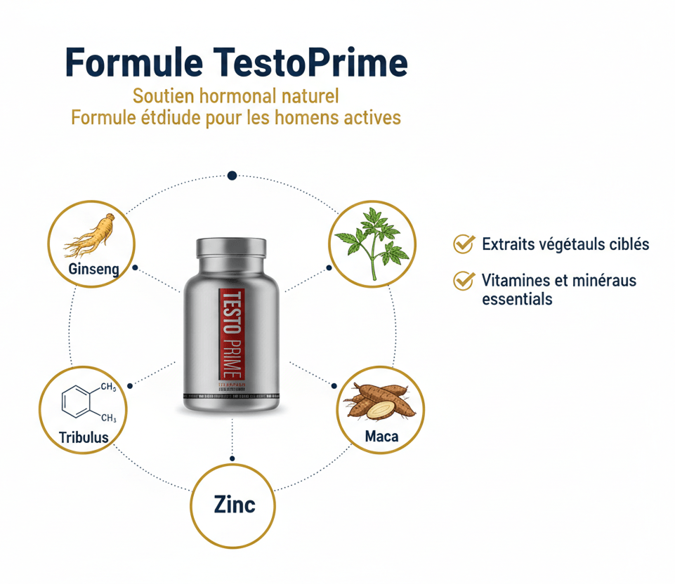 TestoPrime est un booster de testostérone naturel, formulé sans hormones de synthèse ni stéroïdes. Il combine des extraits végétaux, des vitamines et des minéraux reconnus pour leur rôle dans la production hormonale masculine.